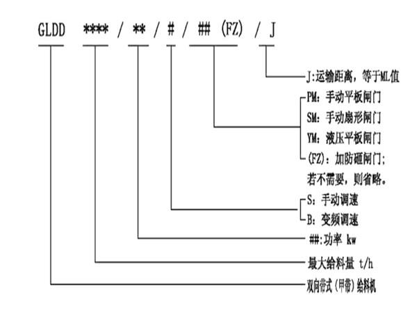 雙向帶式(甲帶)給料機(jī)型號說明: